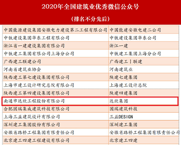 近日,由建筑時(shí)報(bào)社主辦的2020年建筑業(yè)微信公眾號(hào)運(yùn)維經(jīng)驗(yàn)交流研討會(huì)暨2020年全國(guó)建筑業(yè)優(yōu)秀微信公眾號(hào)頒獎(jiǎng)典禮在揚(yáng)州召開(kāi)。會(huì)上,公布了2020年全國(guó)建筑業(yè)“最具影響力”微信公眾號(hào)和2020年全國(guó)建筑業(yè)優(yōu)秀微信公眾號(hào)榜單。達(dá)欣集團(tuán)獲得2020年全國(guó)建筑業(yè)優(yōu)秀微信公眾號(hào)。